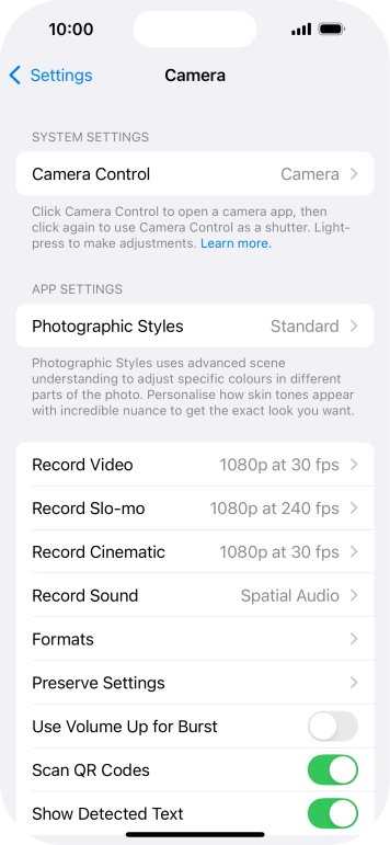 - Press Camera and follow the instructions on the screen to select more camera settings.