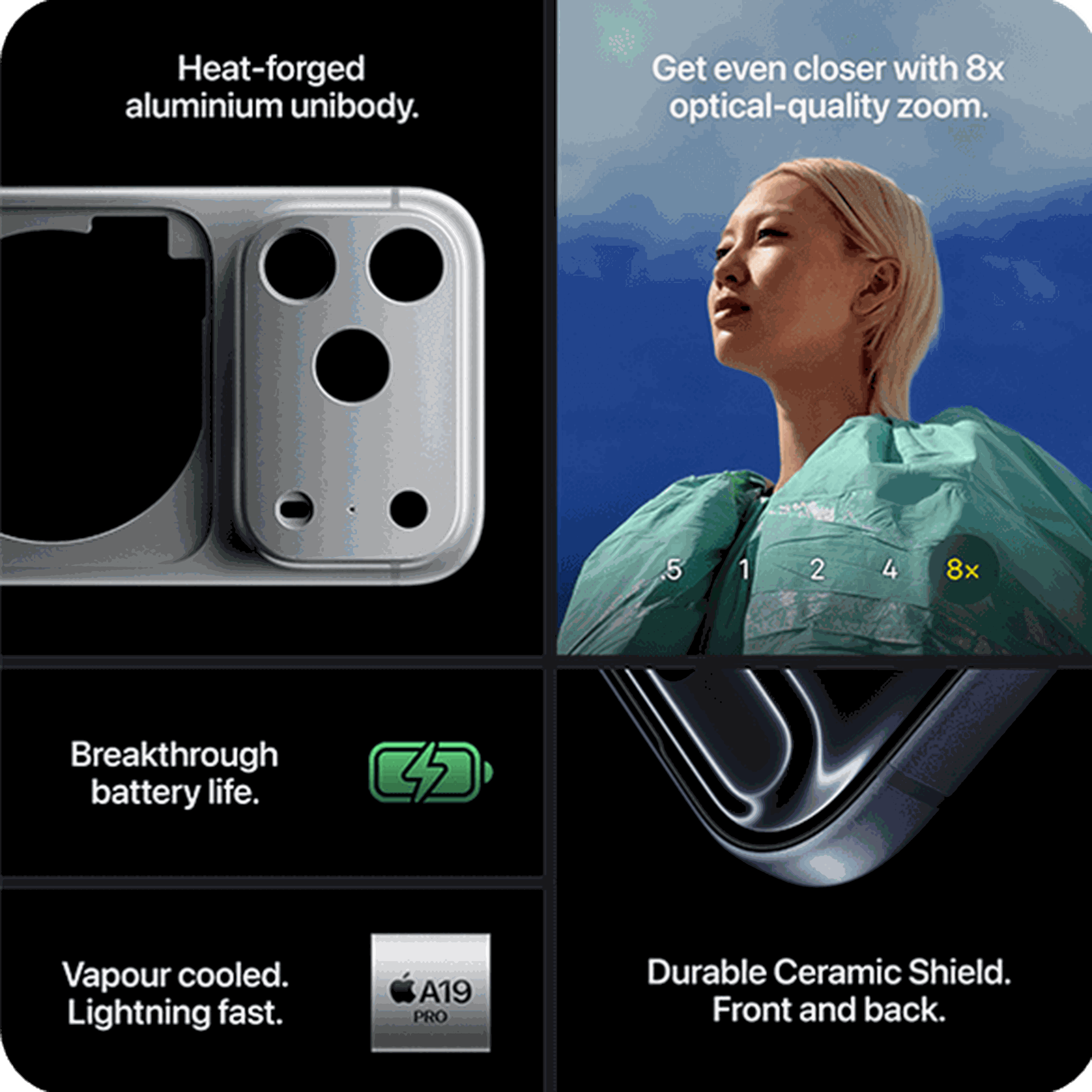 Built with an aluminium unibody design that dissipates heat and an upgraded Ceramic Shield 2 offering industry-leading protection and 3x better scratch resistance. iPhone Pro Max is made to last, from tough adventures to everyday use.